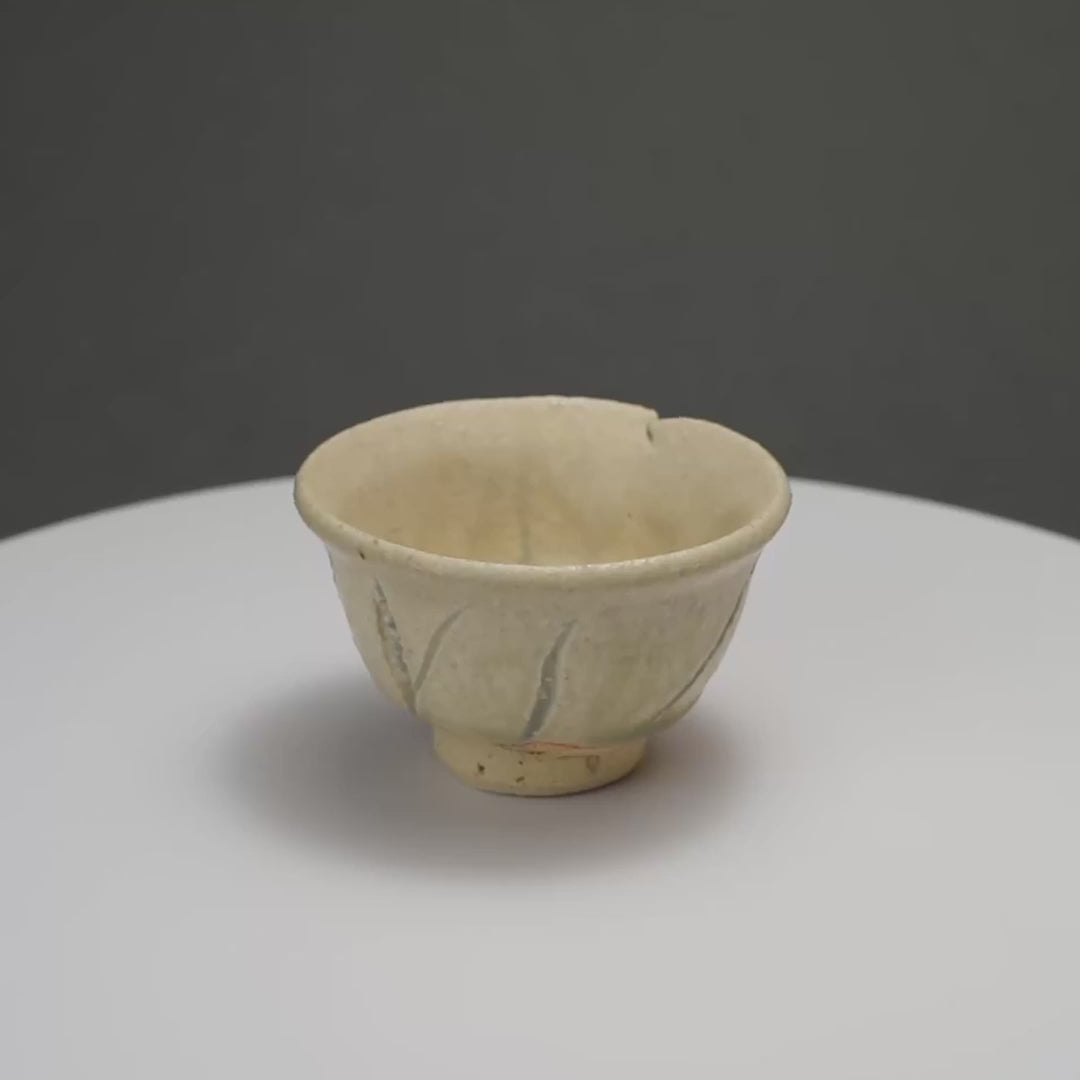 Glaçure Tadanoumi, gravé coupe à saké, cuit dans un four à bois selon des méthodes traditionnelles ; les flux de cendre et les variations de température créent des nuances subtiles sur la surface.