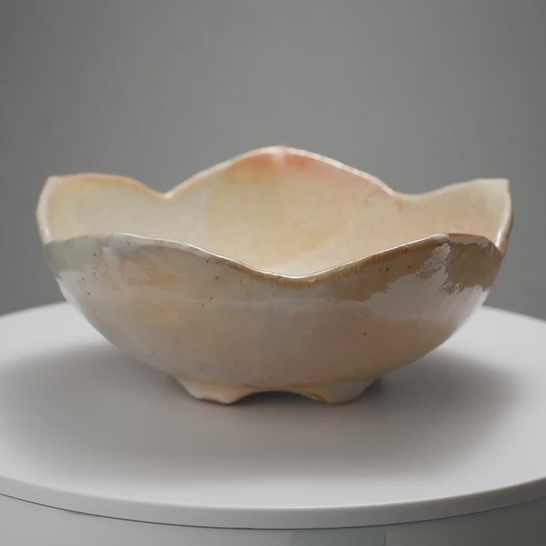 Bol Shino en forme de fleur, cuit dans un four à bois ; le flux de glaçure et la chaleur produisent des nuances subtiles.